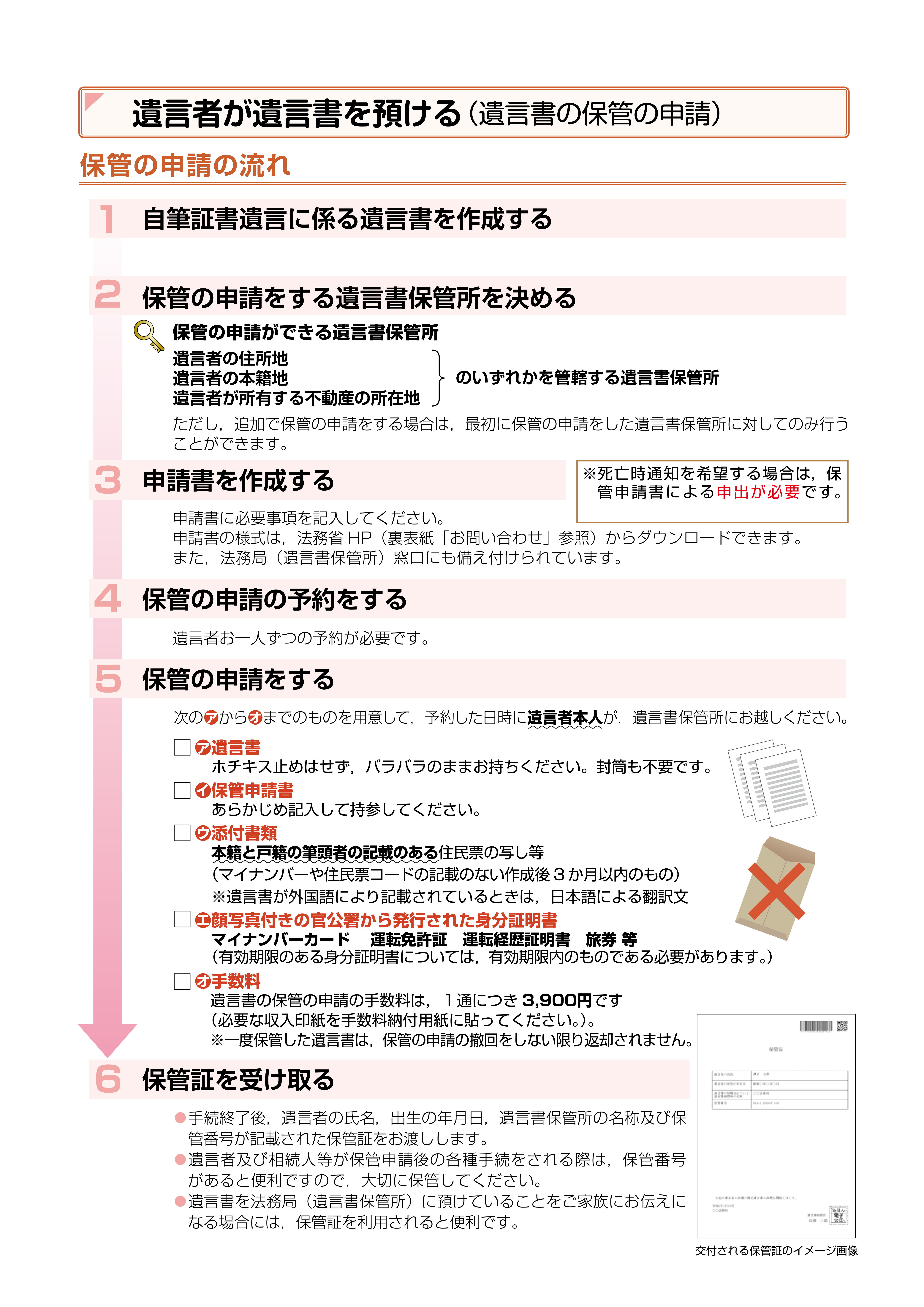 自筆証書遺言保管の申請は以下ように行っていきます。手数料は1通につき3900円です。