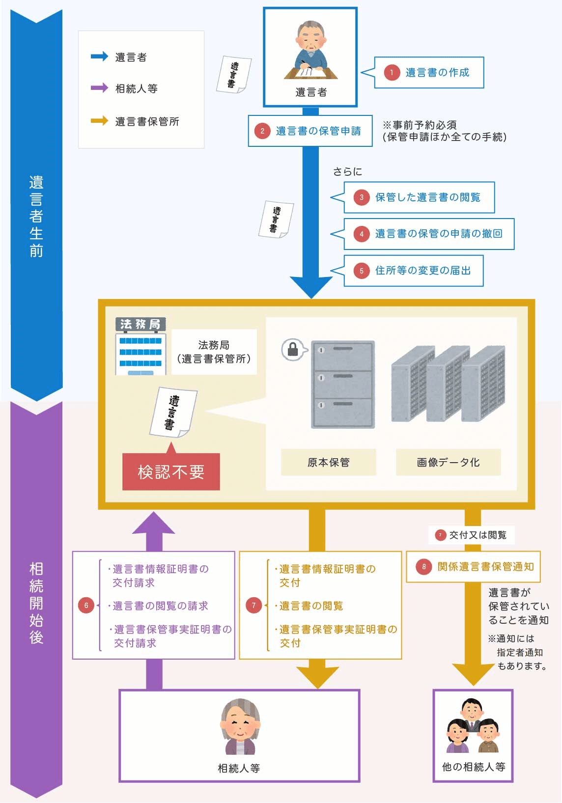 相続開始後は、相続開始後は、相続人等関係者は遺言書の保管の有無に関する証明書の交付、遺言書情報証明書の交付、遺言書の閲覧ができます。